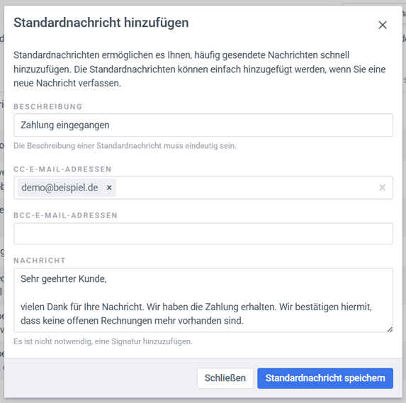 Seit diesem Monat können Sie einer Standardnachricht eine CC- oder BCC-E-Mail-Adresse hinzufügen, sodass bestimmte E-Mail-Adressen immer eine Nachricht erhalten, wenn Sie eine bestimmte Standardnachricht versenden.