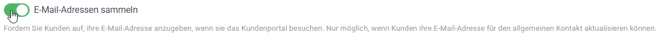 Möchtest du deine Kunden aktiver dazu auffordern, eine E-Mail-Adresse anzugeben, damit möglichst viel eurer Kommunikation per E-Mail erfolgt? Seit Dezember gibt es dafür eine neue Einstellung im Tab „Kundenportal“ in den Administrationseinstellungen. Aktiviere hierzu die Einstellung „E-Mail-Adressen sammeln“.