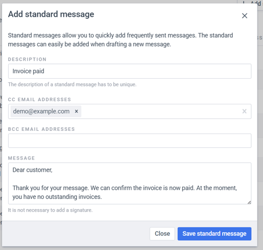 From this month onwards, you can add a CC or BCC email address to the standard messages, so that specific email addresses always receive an email when you send a particular standard message.