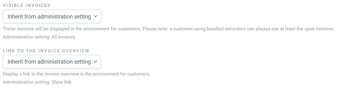 Go to the customer page and select 'Customer settings' at the top right. Open the 'Customer portal' tab. Here you can determine which invoices the customer may view in the online portal. This setting overrides the default administration settings.