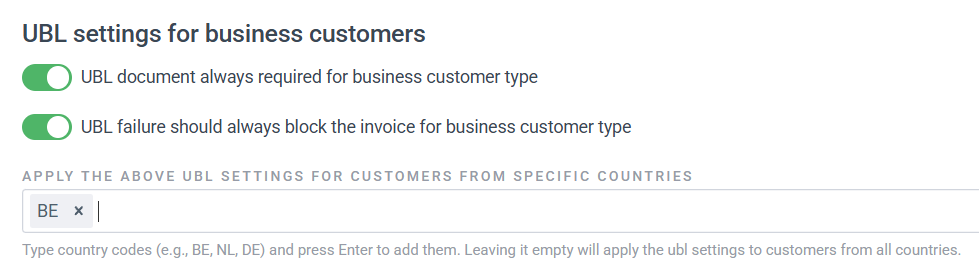 Under 'UBL settings for business customers,' you can specify whether invoices should be sent via Peppol for business customers, and whether the invoice should be blocked if the Peppol sending fails.