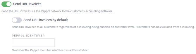 Enabling this setting ensures that UBL documents are sent to all customers, regardless of whether e-invoicing is enabled at customer level. If some customers do not need to be invoiced via Peppol, you can disable this for the customer. - Send UBL invoices by default disabled