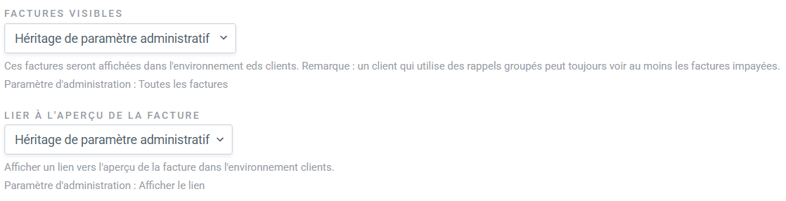 Allez sur la page du client et sélectionnez « Paramètres du client » en haut à droite. Ouvrez l’onglet « Portail client ». Vous pouvez y définir quelles factures le client peut consulter dans le portail en ligne. Ce paramètre remplace les paramètres par défaut de l’administration.