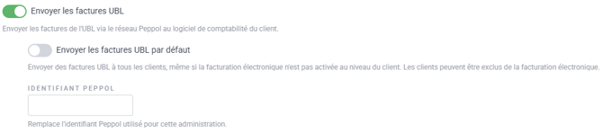L'activation de ce paramètre garantit que les documents UBL sont envoyés à tous les débiteurs, que la facturation électronique soit activée ou non au niveau du débiteur. Si certains débiteurs ne doivent pas être facturés via Peppol, vous pouvez désactiver cette option pour le débiteur concerné. - Envoyer les factures UBL par défaut désactivé
