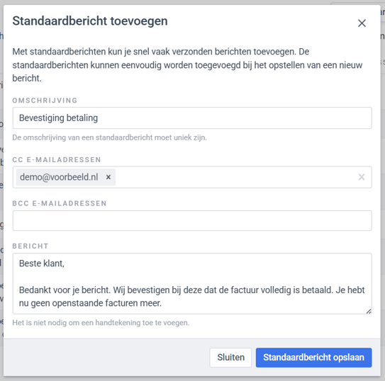 Sinds deze maand kun je een CC of BCC e-mailadres toevoegen aan de standaardberichten, zodat je altijd bepaalde e-mailadressen een e-mail stuurt wanneer je een specifiek standaardbericht verstuurt.