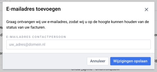 In het online portaal krijgt de debiteur een pop-up te zien met de vraag een e-mailadres door te geven. Deze wordt dan ook gelijk in gebruik genomen en kun je zelf weer overnemen in je boekhoudpakket.