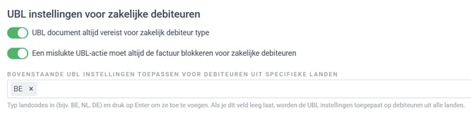 Onder 'UBL instellingen voor zakelijke debiteuren' bepaal je hier of er via Peppol moet worden verzonden als de debiteur zakelijk is, en of de factuur geblokkeerd moet worden als de Peppol-verzending mislukt.