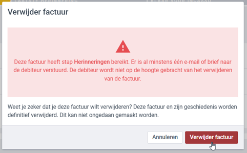 - Indien er al stappen in de factuur zijn uitgevoerd, bijvoorbeeld de factuurverzending of herinneringen, krijg je eerst een waarschuwing om te verifiëren dat je dit zeker weet. Daarna kan de factuur worden verwijderd.