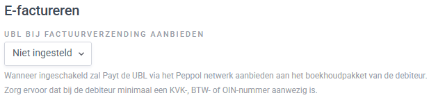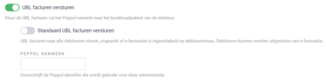 Houd je deze instelling uitgeschakeld, dan worden UBL documenten alleen naar debiteuren verstuurd als e-facturatie bij de debiteur is ingeschakeld.